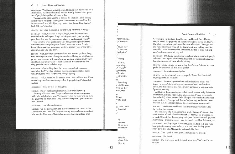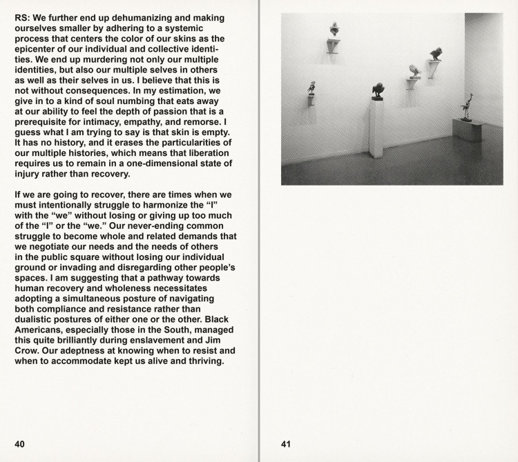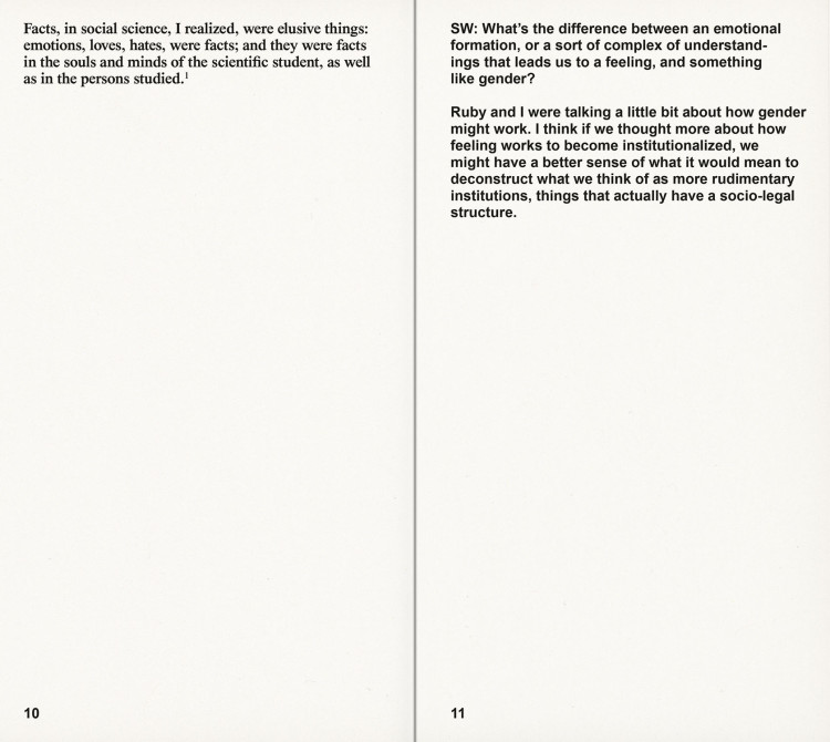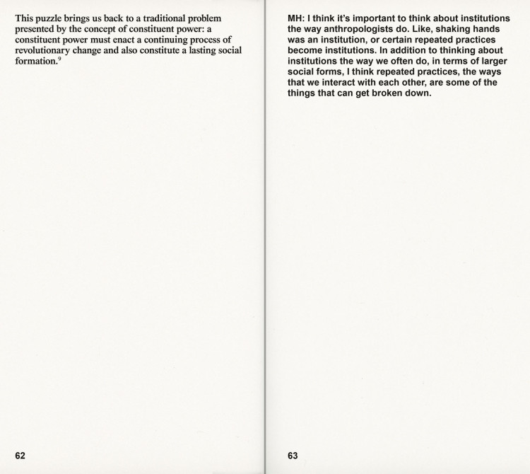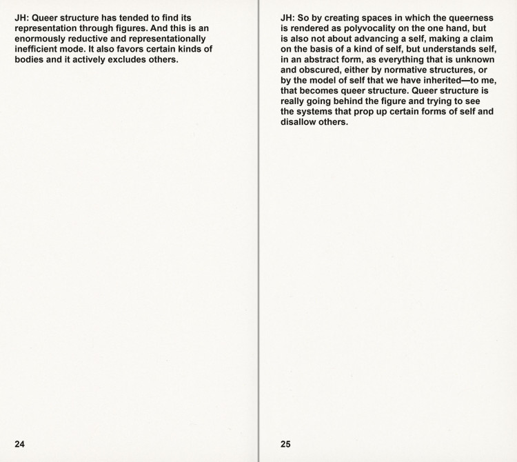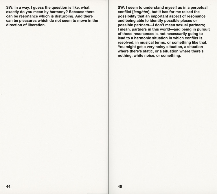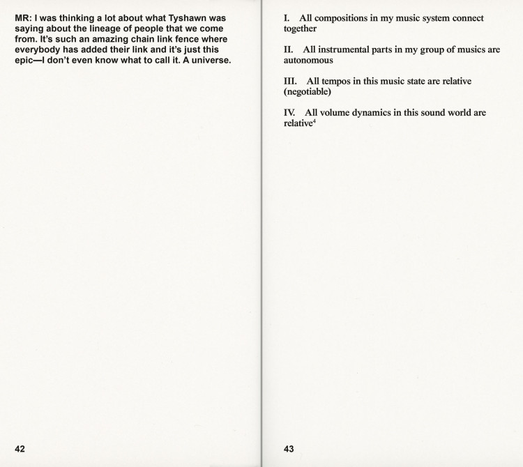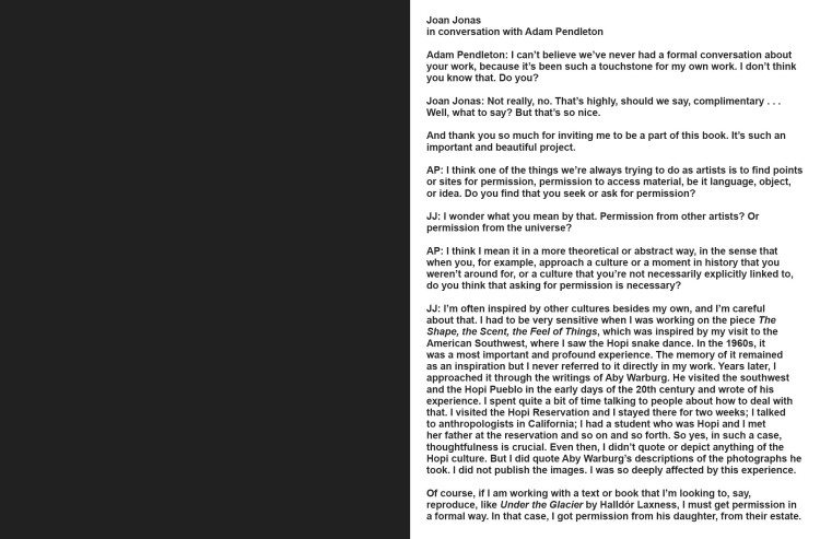Introduction by Adam Pendleton. Interviews with Thomas Hirschhorn, Ishmael Houston-Jones, Joan Jonas, Lorraine O’Grady, and Joan Retallack.