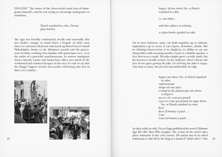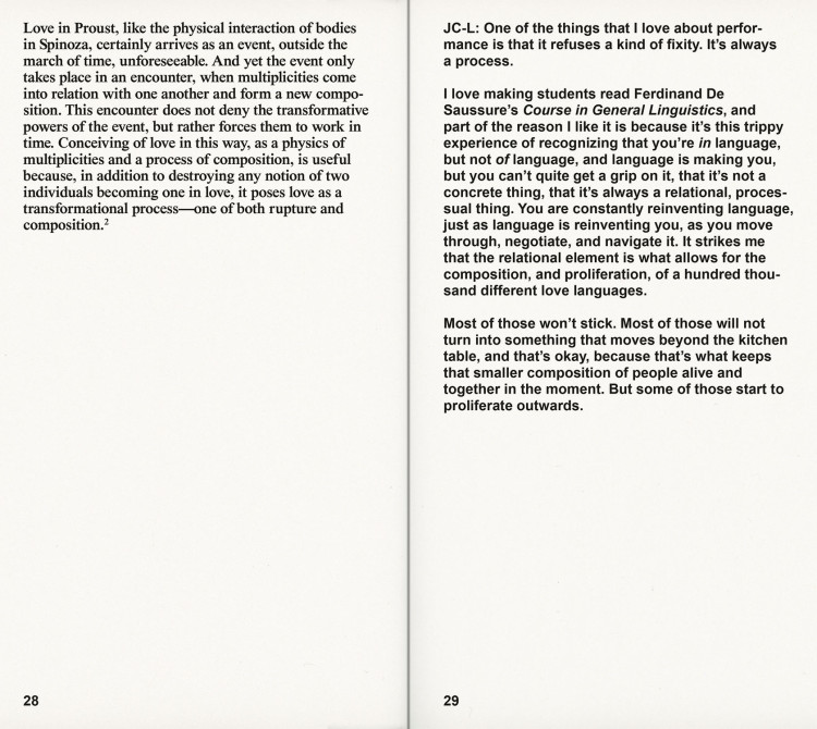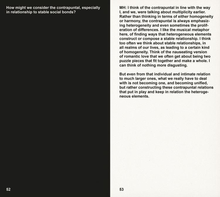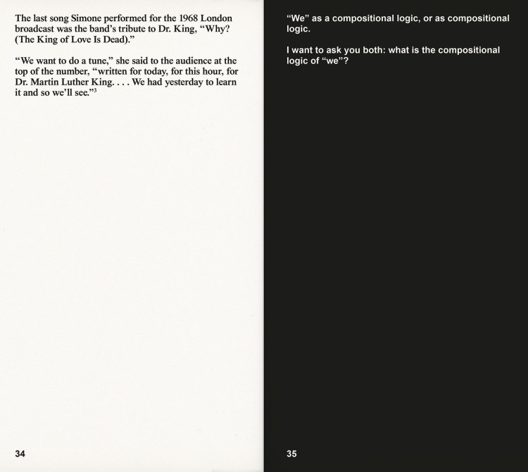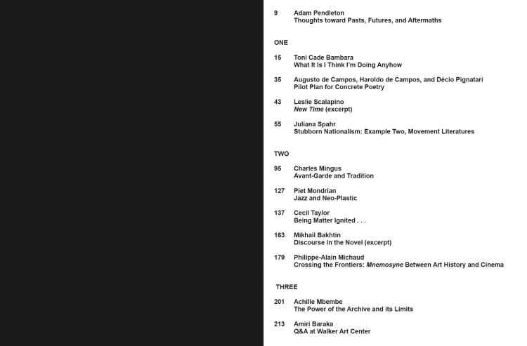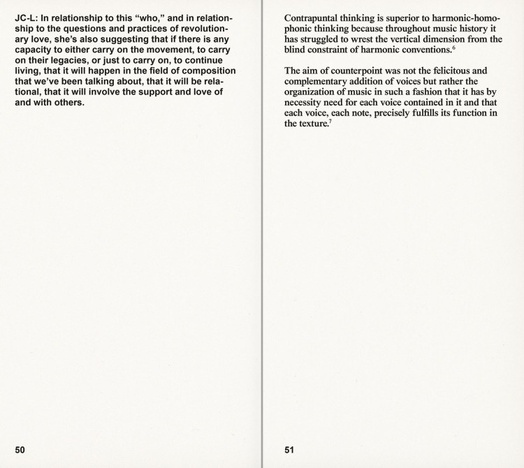Source texts by Sara Ahmed, Mikhail Bakhtin, Toni Cade Bambara, Amiri Baraka, Augusto de Campos, Hardoldo de Campos, and Décio Pignatari, Angela Davis, Gilles Deleuze, Julius Eastman, Adrienne Edwards, Clarice Lispector, Achille Mbembe, Philippe-Alain Michaud, Charles Mingus, Piet Mondrian, Leslie Scalapino, Leonard Schwartz and Michael Hardt, Juliana Spahr, Cecil Taylor, and Malcolm X.
