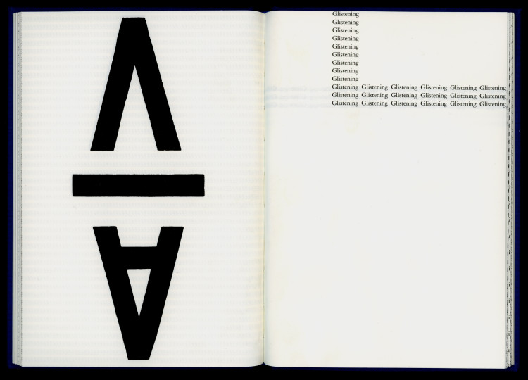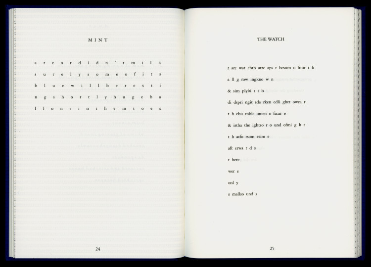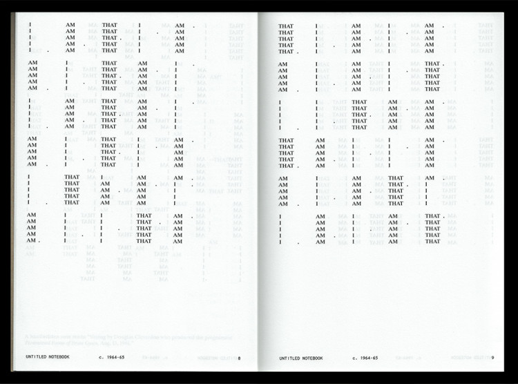 Pritchard’s writing is visually and typographically unconventional. His methodical arrangements of letters and words disrupt normative optical flows and lexical cohesion, modulating the speeds of reading and looking by splitting, spacing, and splicing linguistic objects. His manipulation of text and codex resembles that of concrete poetry and conceptual writing, traditions from which literary history has mostly excluded him. Pritchard also worked with sound, and his dynamic readings—documented, among few other places, on the album New Jazz Poets (Folkways Records, 1967)—make themselves heard on the page.