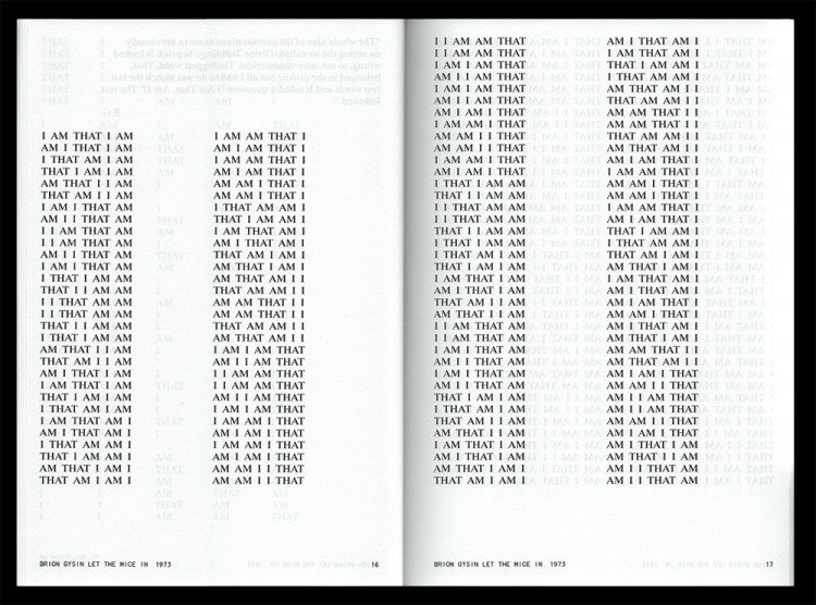 “The permutated poems set the words spinning off on their own; echoing out as the words of a potent phrase are permutated into an expanding ripple of meanings which they did not seem to be capable of when they were struck and then stuck into that phrase. The poets are supposed to liberate the words—not to chain them in phrases. Who told poets they were supposed to think? Poets are meant to sing and to make words sing. Poets have no words ‘of their very own.’ Writers don’t own their words. Since when do words belong to anybody. ‘Your very own words,’ indeed ! And who are you?” —Brion Gysin, “Cut-Ups Self-Explained,” 1959