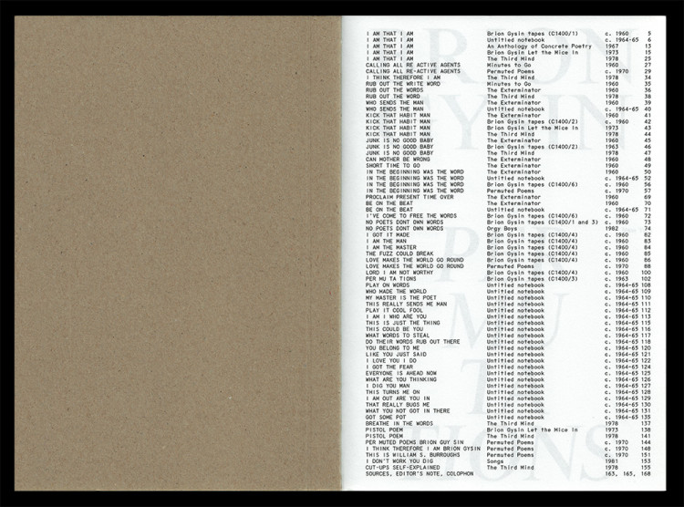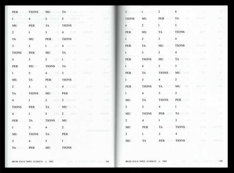 There were several versions of many of the permutation poems, which were also presented in multiple media; some were published in books, while others exist only as audio recordings. Many of them derive from a 1961 BBC radio commission, “The Permutated Poems of Brion Gysin,” in which readings of the texts were recorded, cut up, modulated, and overlapped. The present collection brings together all published and—where transcribable—unpublished versions of each poem, as well as a short expository text by Gysin. The poems are organized in chronological order by first publication or first recording, with further versions of each poem grouped together in chronological order immediately after the initial version. This organization brings distinctions between versions into relief, allowing readers to explore the playful systematicity that undergirds this remarkable body of work.