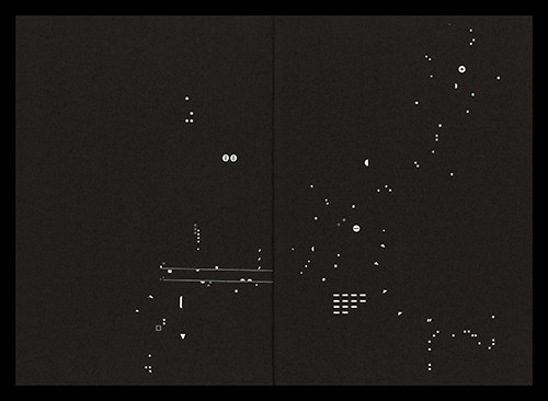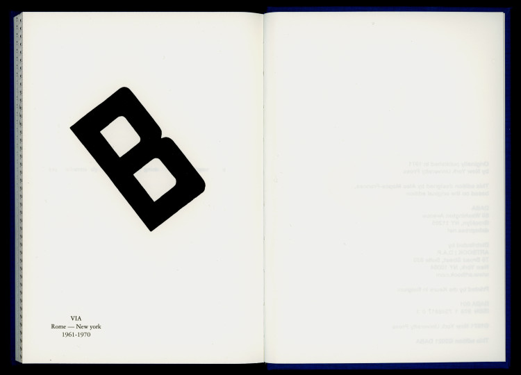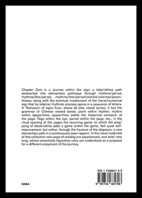 Originally published in 1969 by Lerici Editore in Rome, Capitolo Zero was Sandri’s first book-length work. Composed with dry-transfer lettering instead of a typewriter, it is an experiment in new reading operations. On every page, Sandri dissolves poetry into single letters and punctuation marks—the atomic particles of language—rearranging them in new combinations that preclude conventional meaning. Reading the book is a game for the eyes.