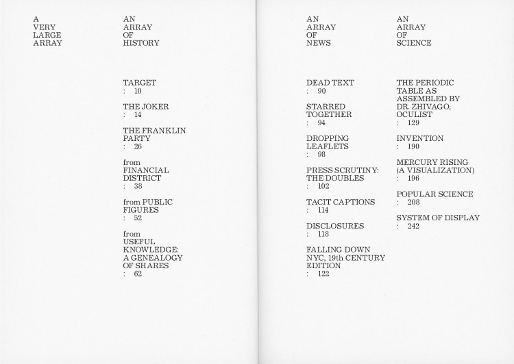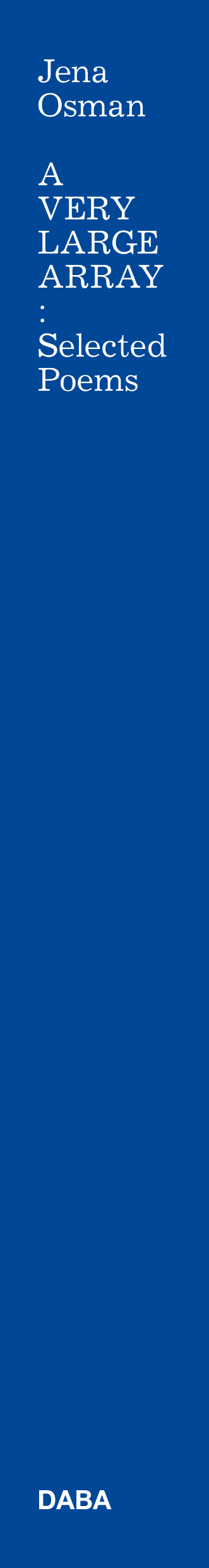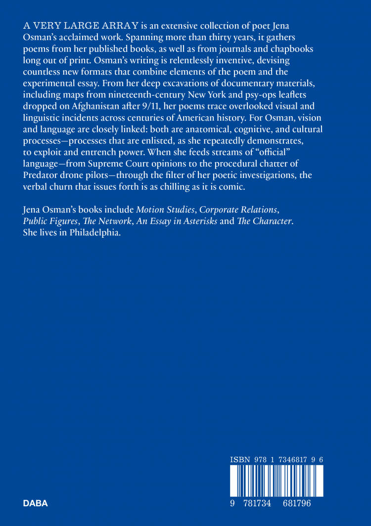 A Very Large Array is an extensive collection of poet Jena Osman’s acclaimed work. Spanning more than thirty years, it gathers poems from her published books, as well as from journals and chapbooks long out of print. Osman’s writing is relentlessly inventive, devising countless new formats that combine elements of the poem and the experimental essay. From her deep excavations of documentary materials, including maps from nineteenth-century New York and psy-ops leaflets dropped on Afghanistan after 9/11, her poems trace overlooked visual and linguistic incidents across centuries of American history. For Osman, vision and language are closely linked: both are anatomical, cognitive, and cultural processes—processes that are enlisted, as she repeatedly demonstrates, to exploit and entrench power. When she feeds streams of “official” language—from Supreme Court opinions to the procedural chatter of Predator drone pilots—through the filter of her poetic investigations, the verbal churn that issues forth is as chilling as it is comic.