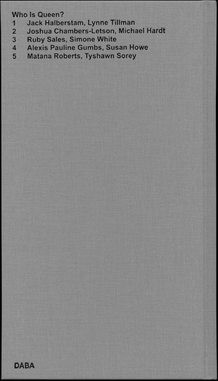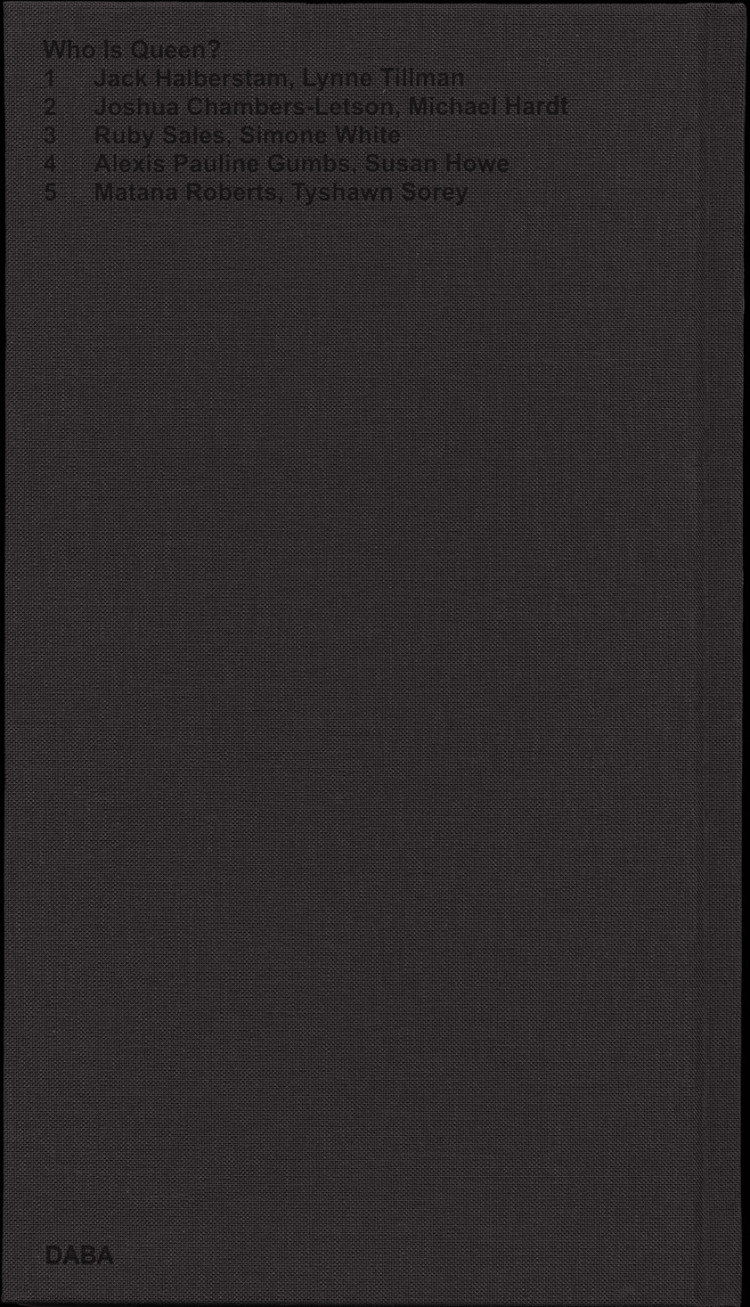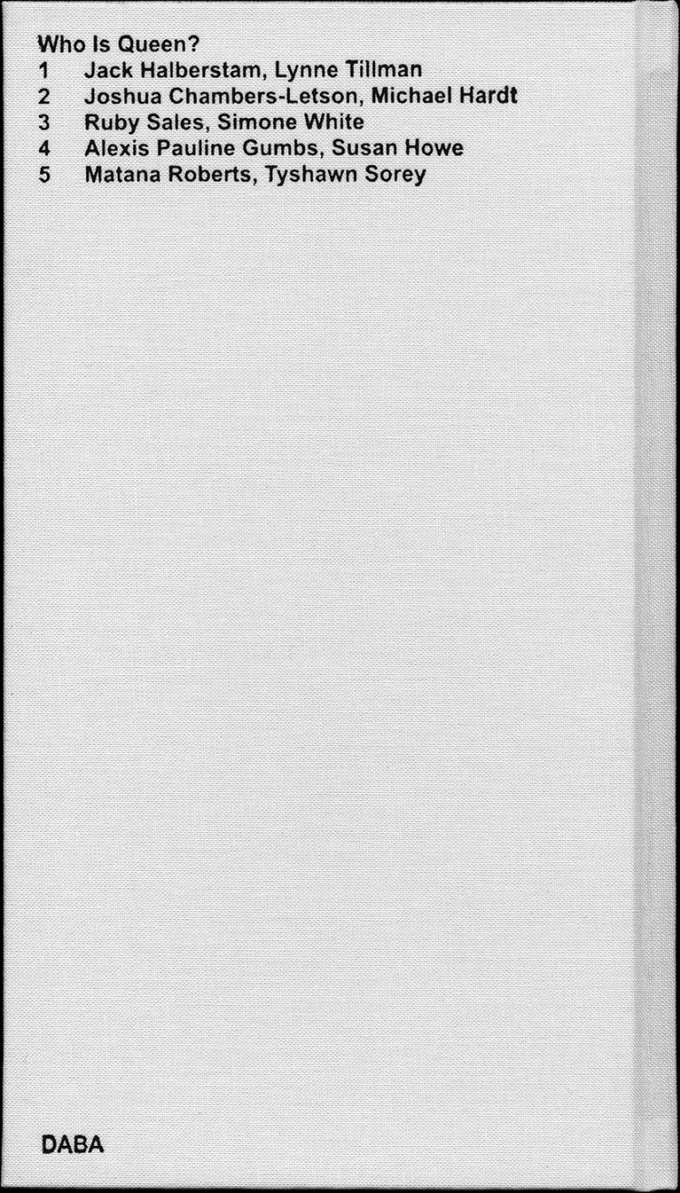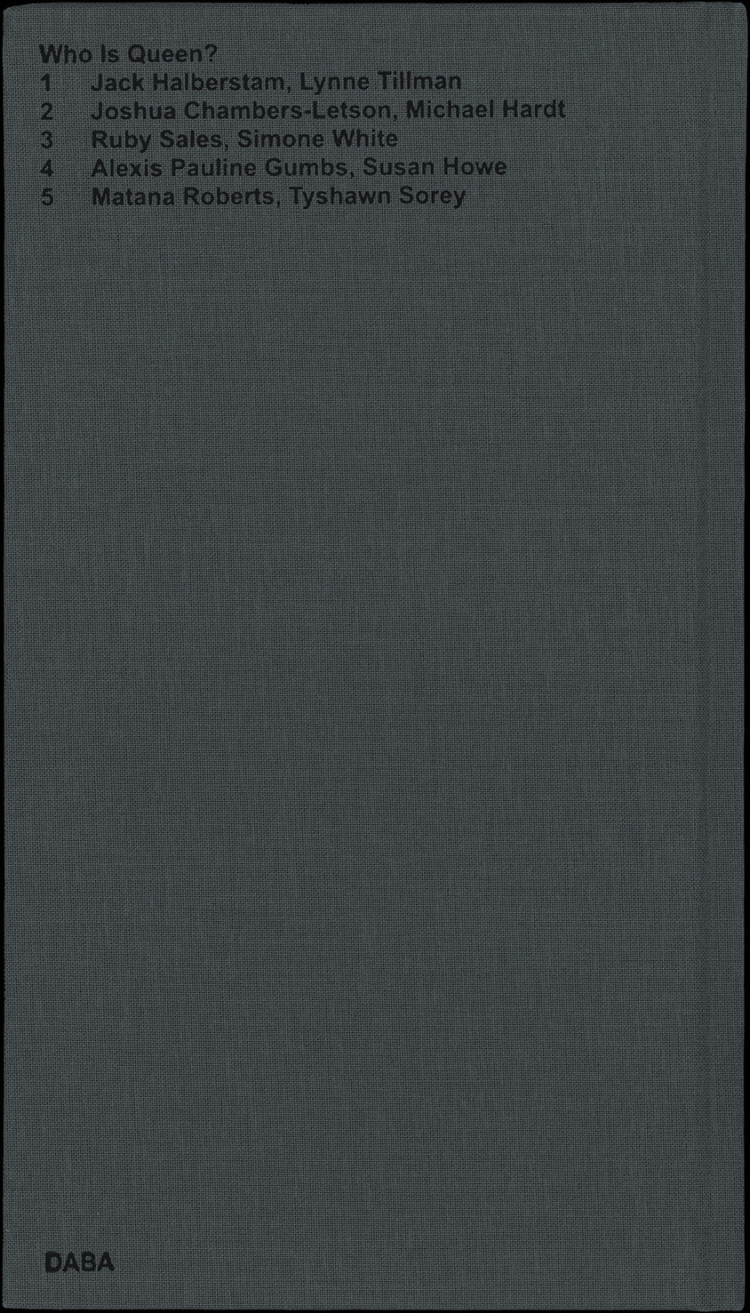Published on the occasion of Adam Pendleton: Who Is Queen? at the Museum of Modern Art, New York, the book series Who Is Queen? adapts conversations between pairs of notable writers, theorists, philosophers, and musicians into contrapuntal texts. Transcripts of the original dialogues are intertwined with archival photographs and external texts.