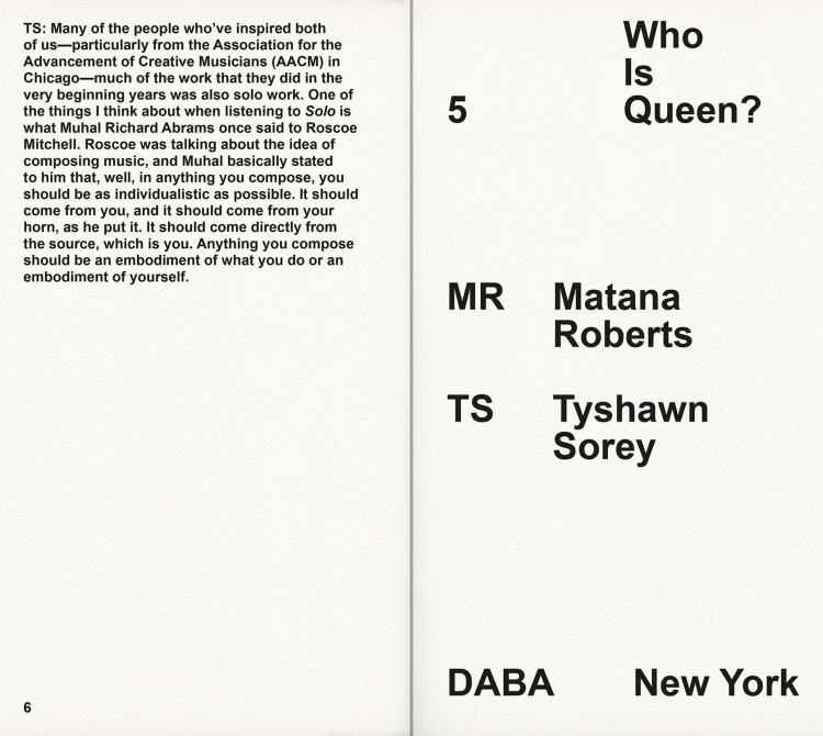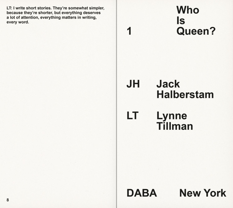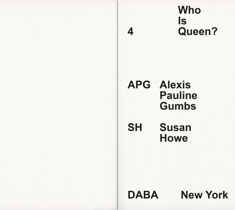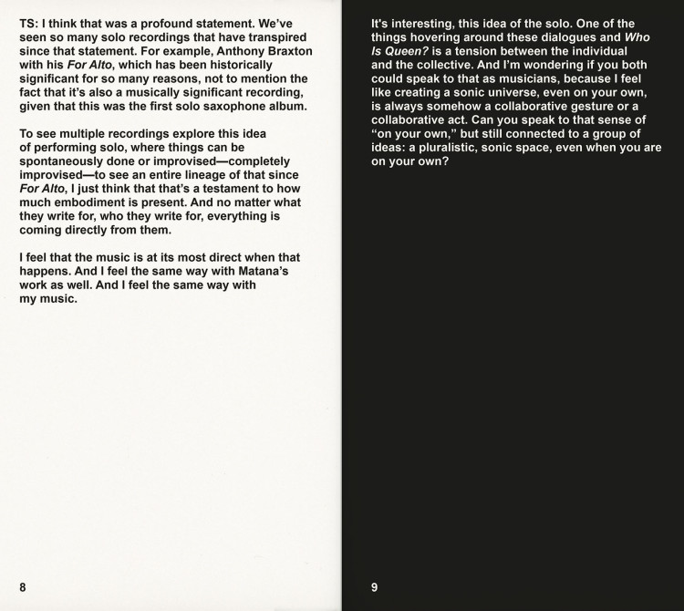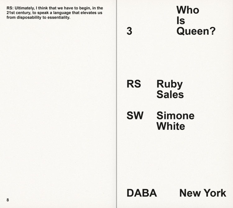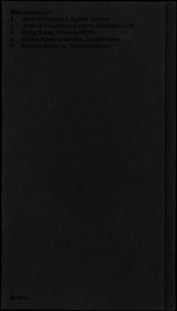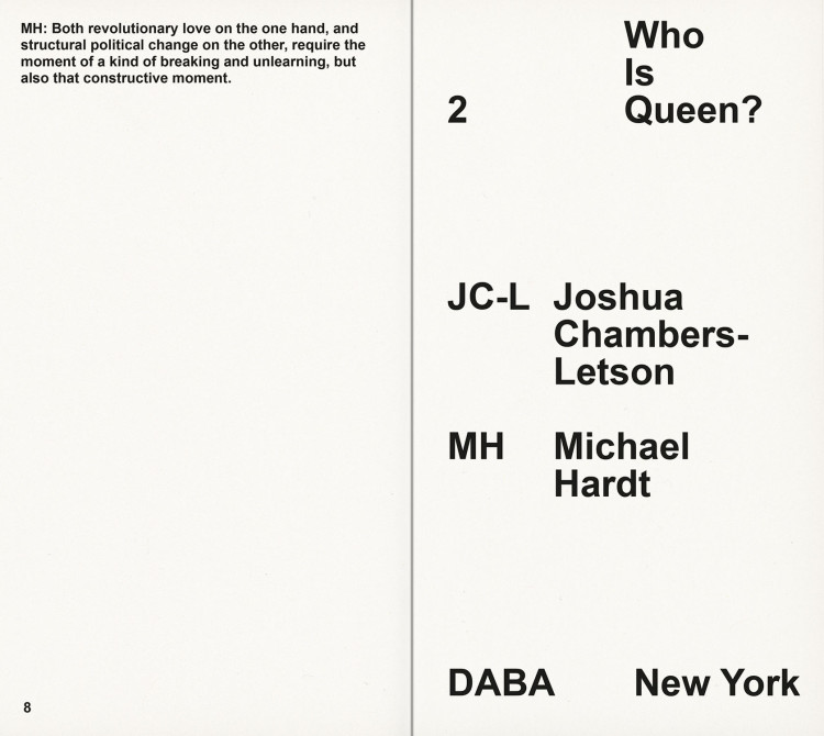Published on the occasion of Adam Pendleton: Who Is Queen? at the Museum of Modern Art, New York, the book series Who Is Queen? adapts conversations between pairs of notable writers, theorists, philosophers, and musicians into contrapuntal texts. Transcripts of the original dialogues are intertwined with archival photographs and external texts.